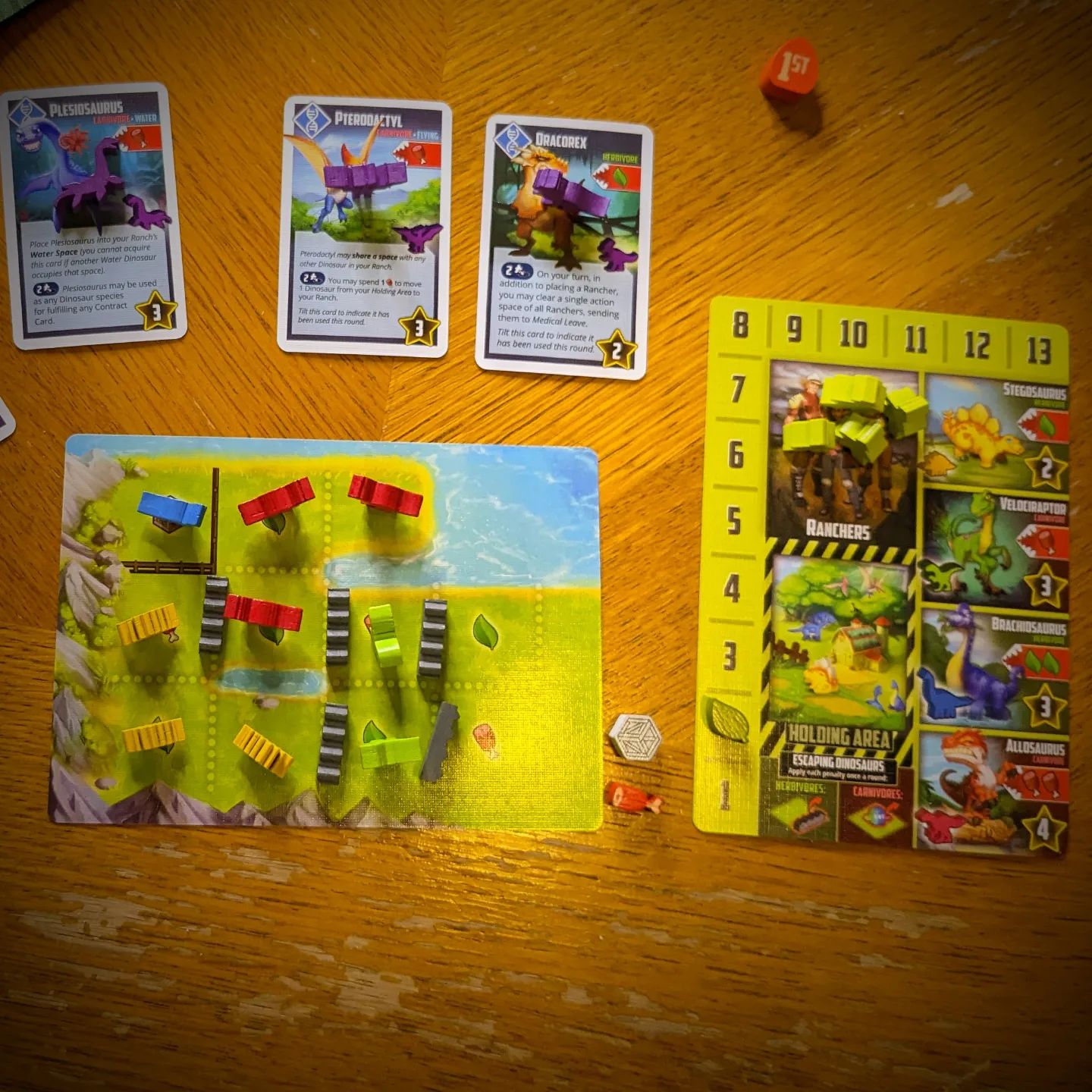 The age recommendation is 14+ but I played this game with my eldest who is only 8. He needed a few hints and guidance, especially when he got stuck in a circle of just breeding Brachiosaurus over and over to feed to his T-Rex, but the majority of his game play was his own. Once he figured out how the contracts benefitted him and gave him victory points at the end of the game he abandoned his favourite dinosaur and it being eaten in pursuit of obtaining what he needed, ending the game with 3 contracts completed and scientific research to boost his final score.